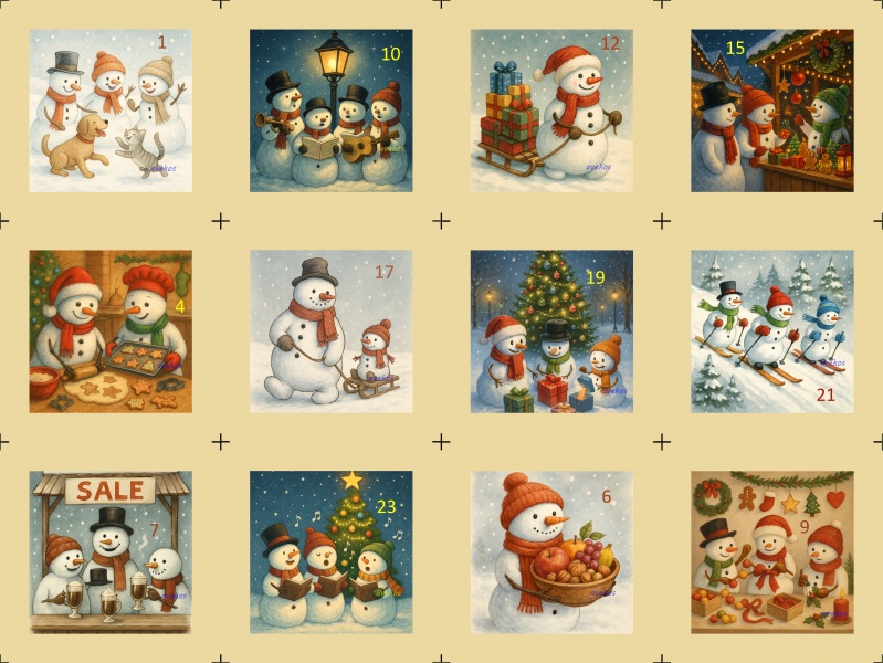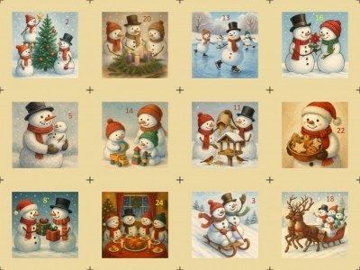 Sada 2 bavlněných panelů s krásnými obrázky sněhuláků a čísly, na výrobu adventního kalendáře, nebo pytlíčků.