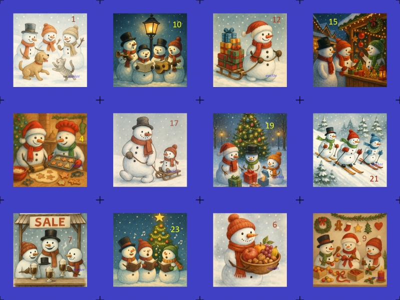 Sada 2 bavlněných panelů s krásnými obrázky sněhuláků a čísly, na výrobu adventního kalendáře, nebo pytlíčků.