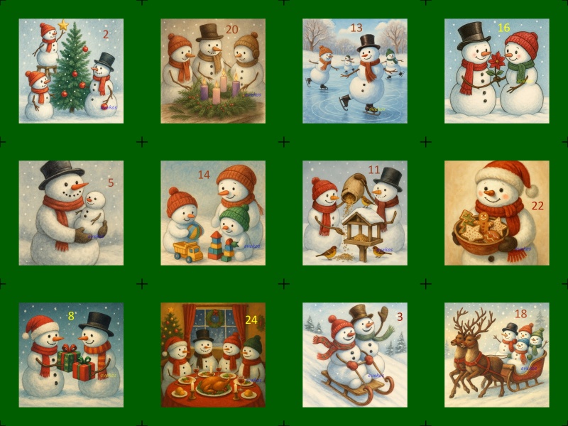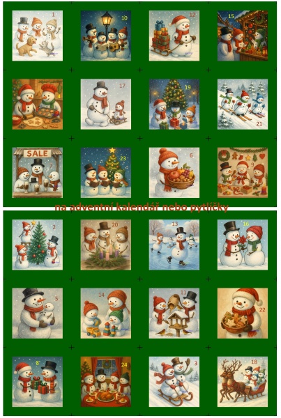 Sada 2 bavlněných panelů s krásnými obrázky sněhuláků a čísly, na výrobu adventního kalendáře, nebo pytlíčků.