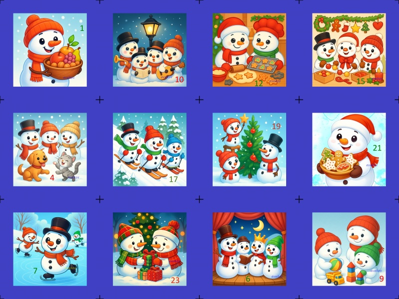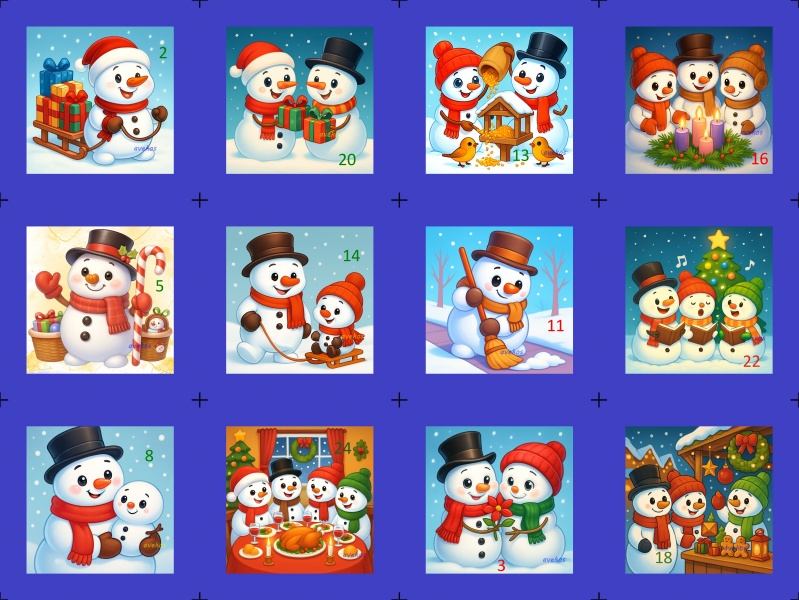 Sada 2 bavlněných panelů s krásnými obrázky sněhuláků a čísly, na výrobu adventního kalendáře, nebo pytlíčků.