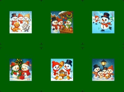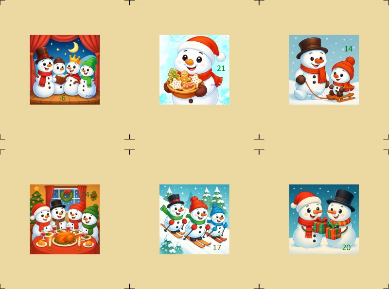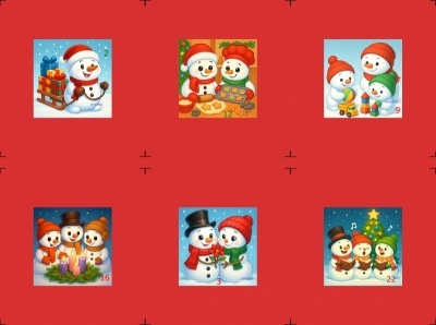 Sada 4 bavlněných panelů s krásnými obrázky sněhuláků a čísly, na výrobu adventního kalendáře, nebo pytlíčků.
