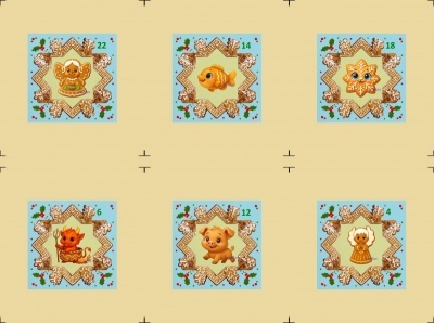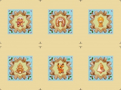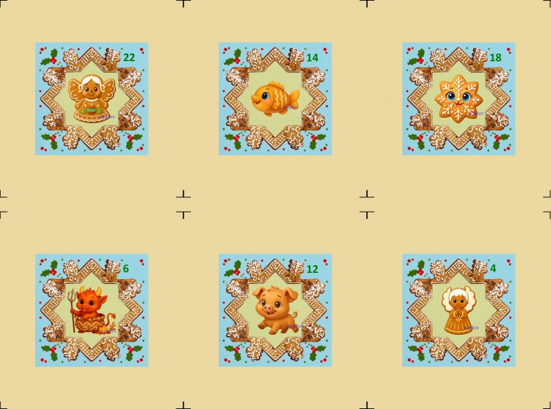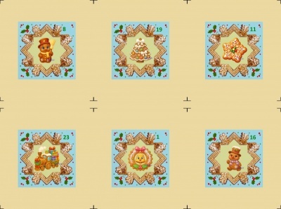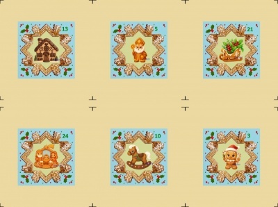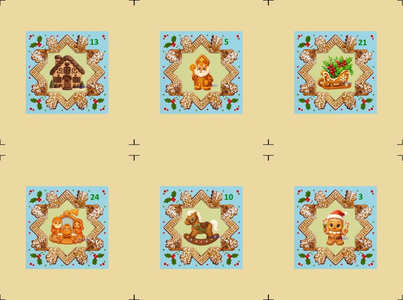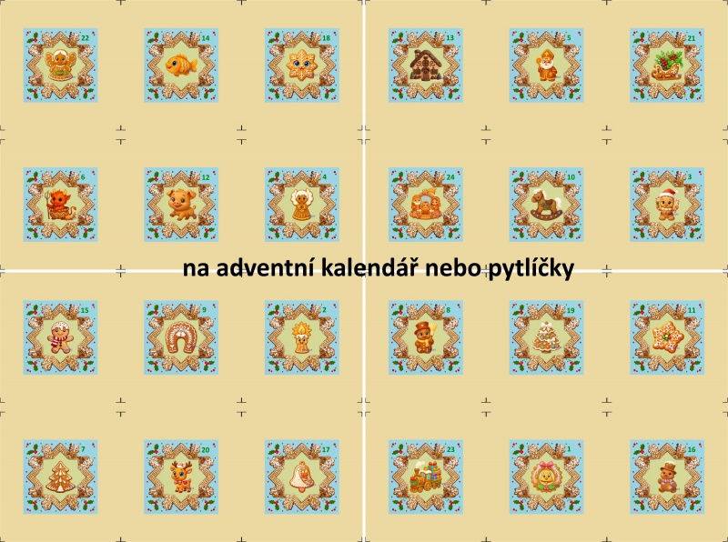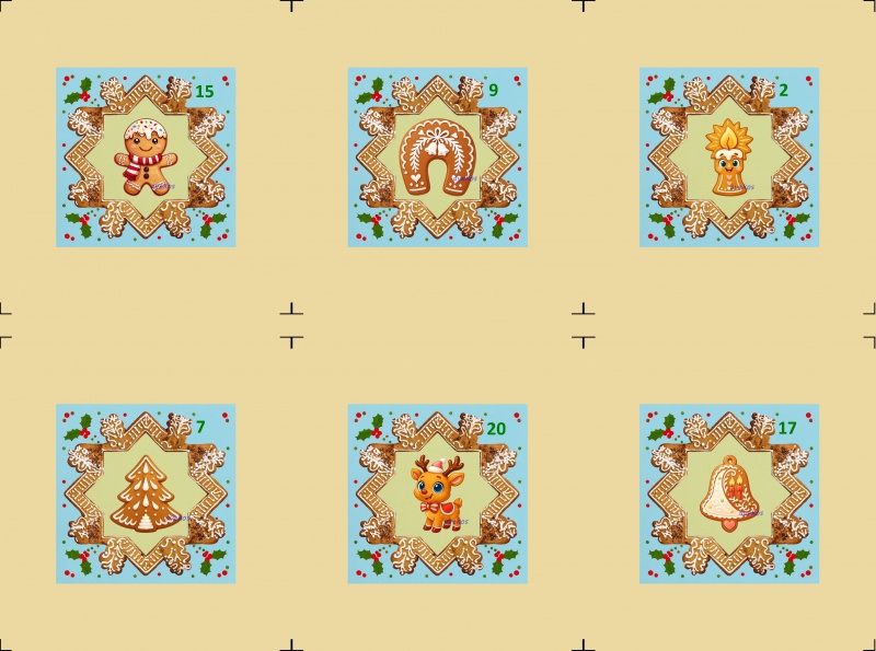 Sada 4 bavlněných panelů s krásnými obrázky perníčků a čísly, na výrobu adventního kalendáře, nebo pytlíčků.