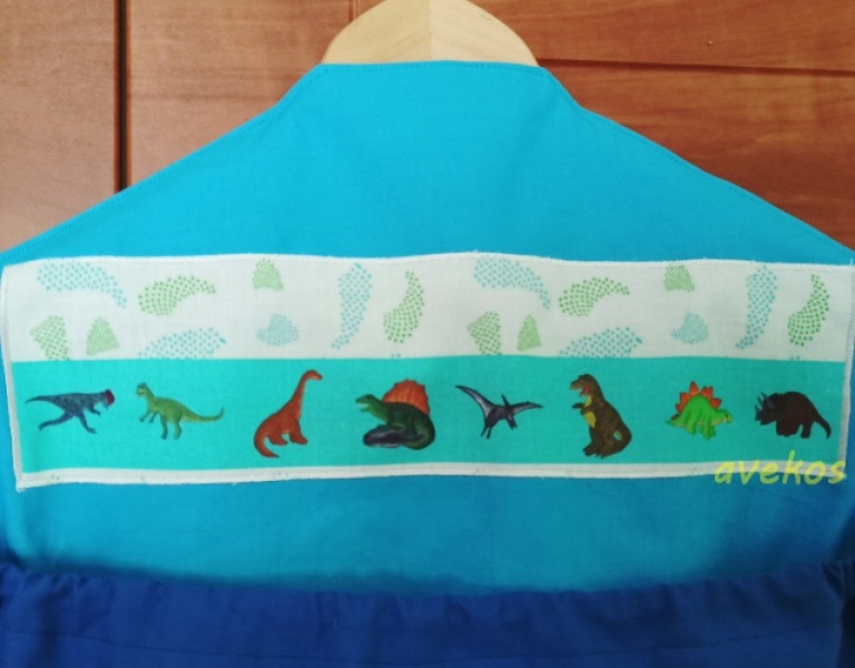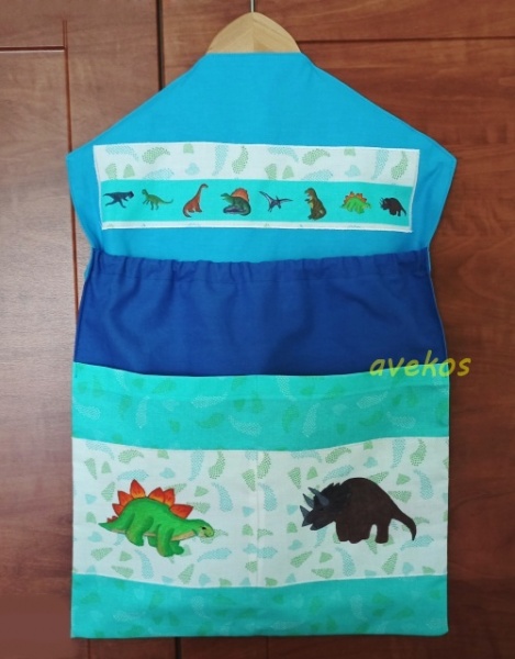 Kapsář do školky má 57 x 38 cm, je celý ušitý z dvojité bavlněné látky, vzadu má průvlek na ramínko a vpředu má velkou kapsu na gumu š. 38 x v. cca 37 cm a vpředu dvě menší vysoké cca 27 cm.