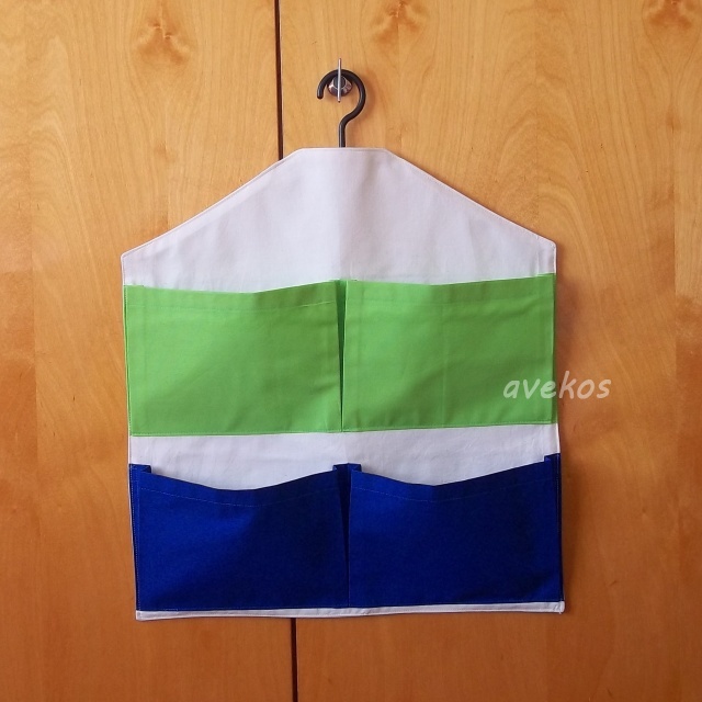 Bavlněný kapsář se zavěšením na ramínko o rozměrech 47 x 38 cm má 4 kapsy. Lze použít ve skříni na drobnosti, zavěsit na dveře, na stěnu, v koupelně, na tábor aj.
