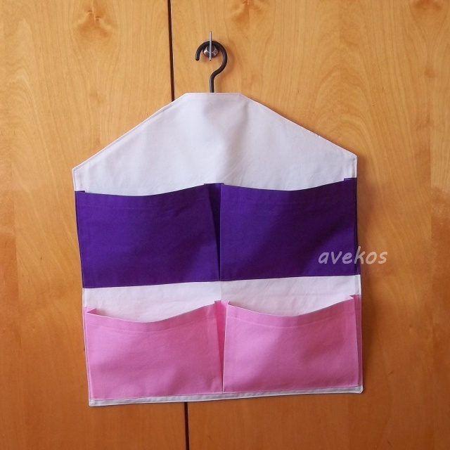 Bavlněný kapsář se zavěšením na ramínko o rozměrech 47 x 38 cm má 4 kapsy. Lze použít ve skříni na drobnosti, zavěsit na dveře, na stěnu, v koupelně, na tábor aj.
