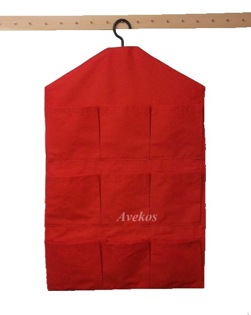 Kapsář se zavěšením na ramínko o rozměrech 66 x 38 cm má 9 kapes ve třech řadách. Kapsář je ušit ze 100% bavlněných látek.