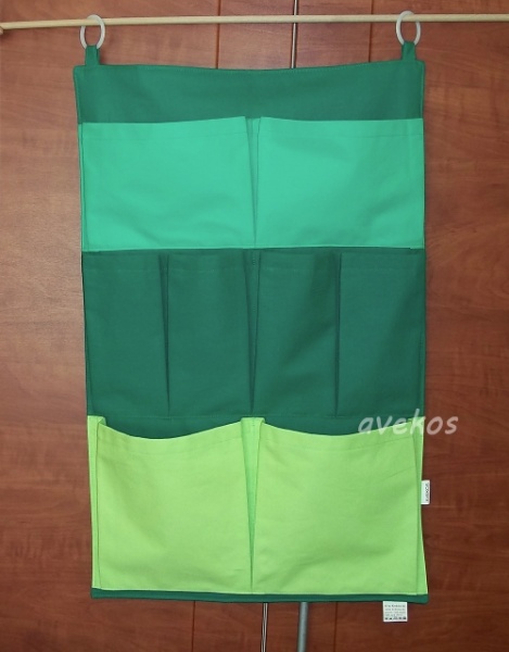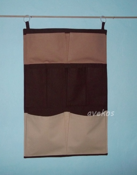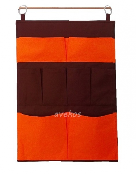 Bavlněný kapsář o rozměrech 42 x 66 cm + poutka, má 8 nabraných kapes, je plněný termolínem, zavěšuje se pomocí kroužků.